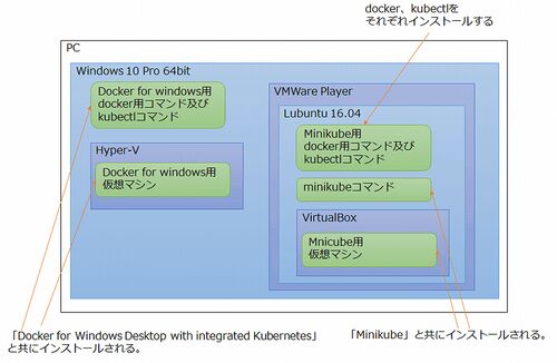 はじめに 結構検討に時間を要したので、件名の件について構成をメモ。 構成 以下が構成です。 補足:Hyper-VとVMWare Playerは、HyperV-Switchで切り替えて使用します。 検討したこと 一つのOSに、「Docker for Windows Desktop with integrated Kubernetes…